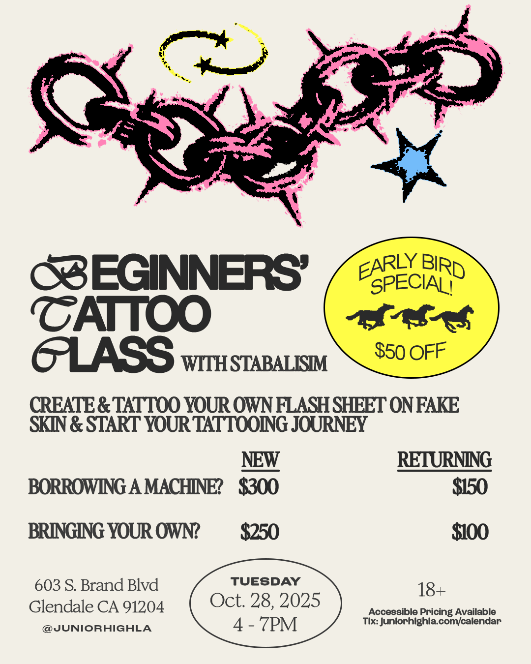 For THIS MONTH only, enjoy $50 off your ticket for the tattoo class!!