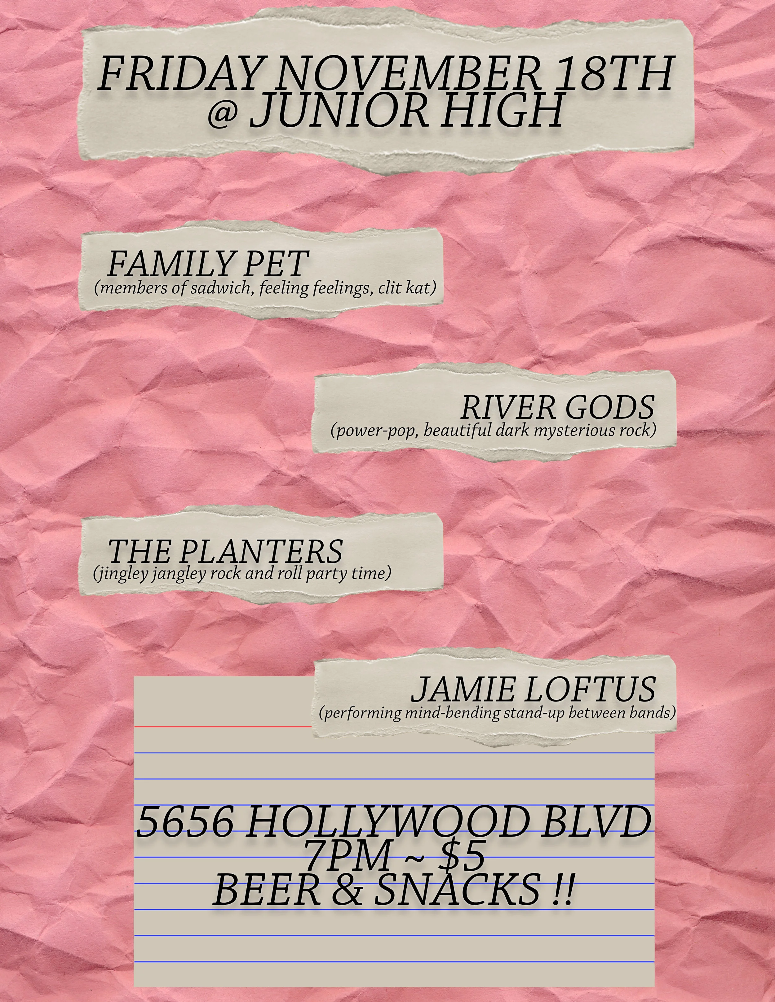 MUSIC + COMEDY / $5 / ALL AGES / Family Pet, River Gods, and The Planters performing with stand-up comedy by Jamie Loftus in between sets.