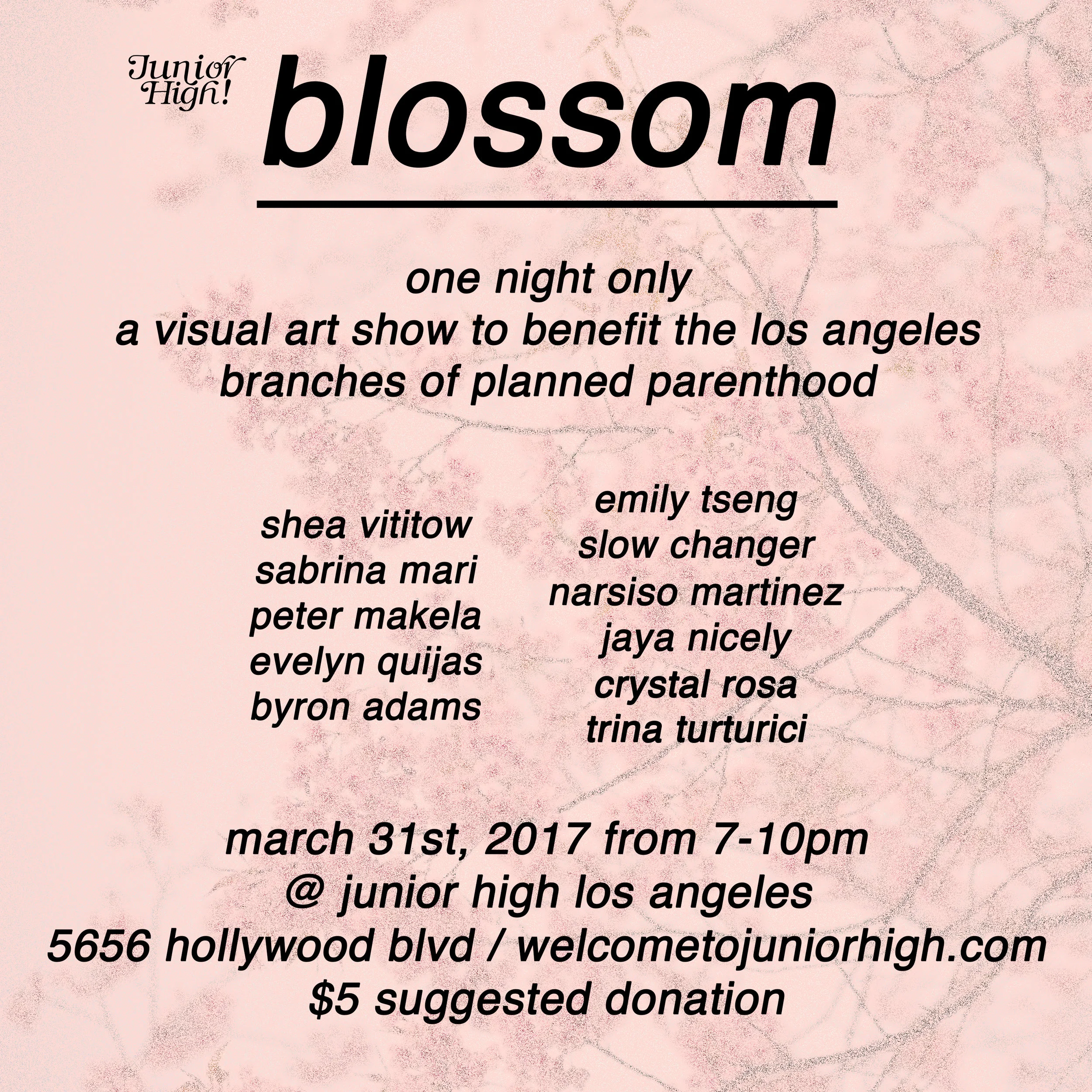 BLOSSOM / a visual art show to benefit PP / one night only Friday, March 31, 2017 7:00 PM 10:00 PM Google Calendar ICS ART / $5 SUGGESTED DONATION / ALL AGES / One night only! A visual art show supporting the Los Angeles branches of Planned Parethood through sales of each piece. RSVP here.