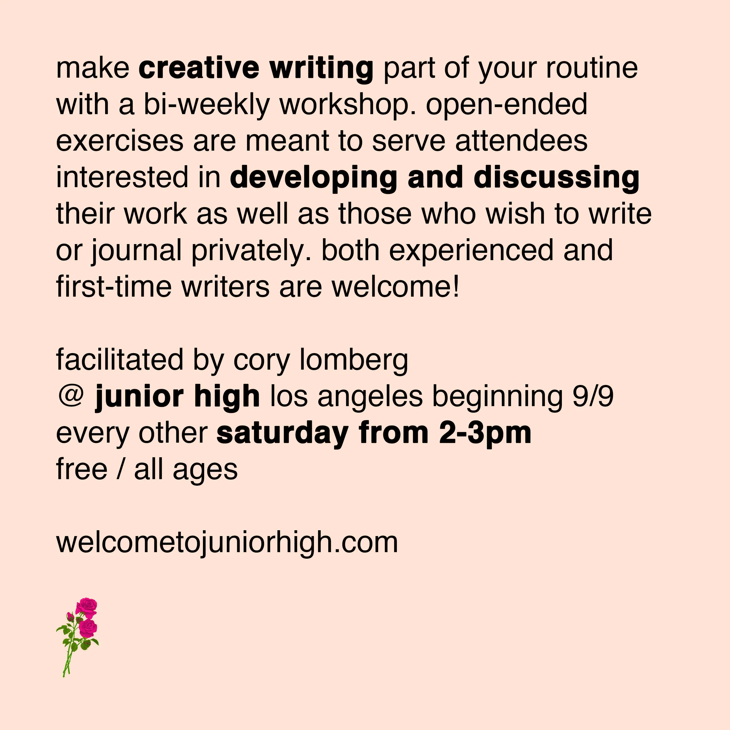 Creative Writing Workshop Saturday, September 23, 2017 2:00 PM 3:00 PM Google Calendar ICS WORKSHOP / FREE / ALL AGES / Join Cory Lomberg every other Saturday from 2-3pm for a loosely facilitated creative workshop to develop and discuss your work or have a space to create privately. All writers welcome!