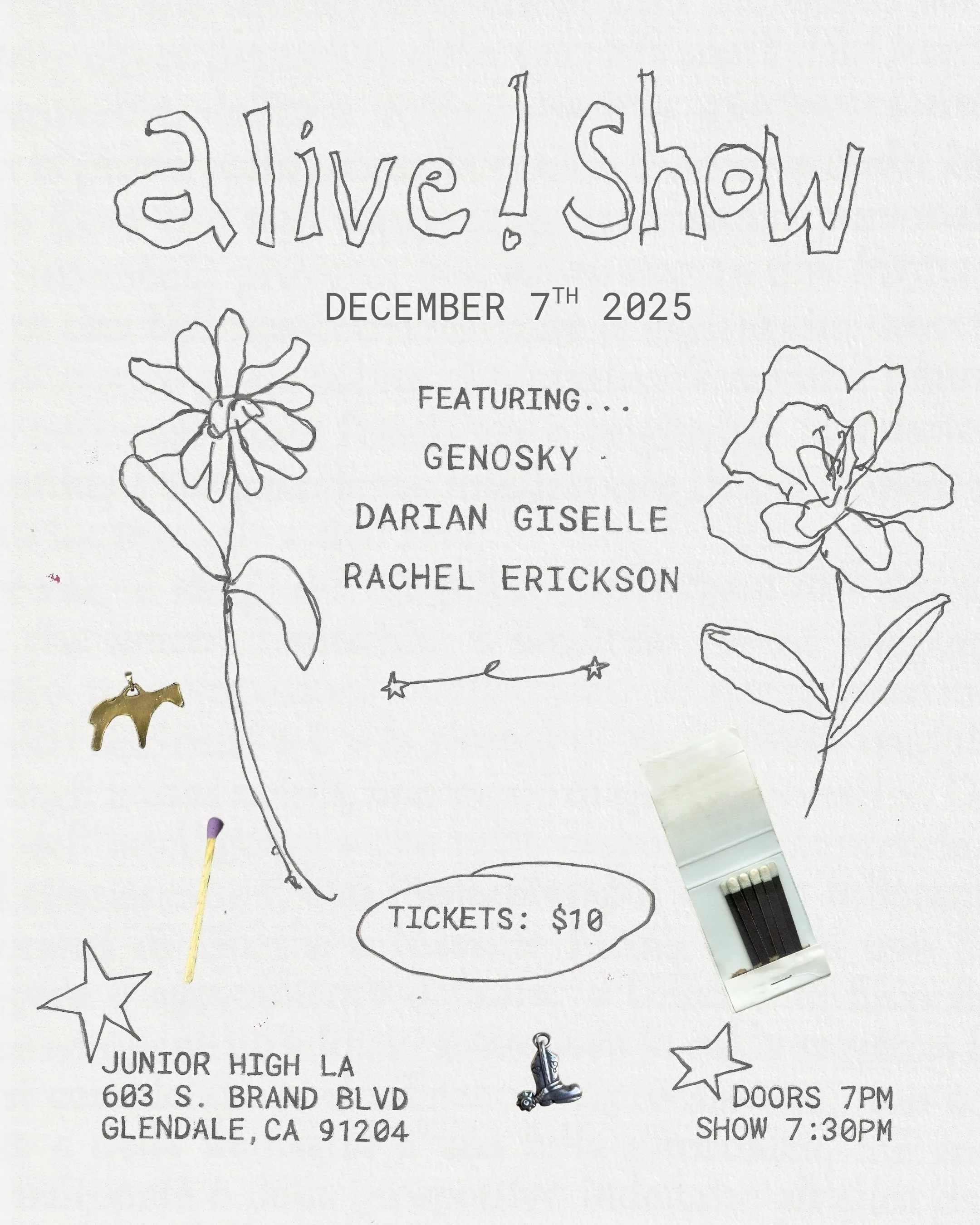 MUSIC | $10 | ALL AGES | Looking to be in community, listen, love, laugh, enjoy something beautiful, create, and maybe shed a tear or two? Join us for the Alive! Show, a cozy living room style night of music meant to help us slow down and reconnect during a hectic season. This event will feature intimate sets, original songs, gentle storytelling, and warm, heart-centered connection from Genosky, Darian Giselle, and Rachel Erickson. With the holidays approaching and the world feeling overwhelming, this show offers a space to breathe, feel supported, and remember what it means to simply be here and be alive.