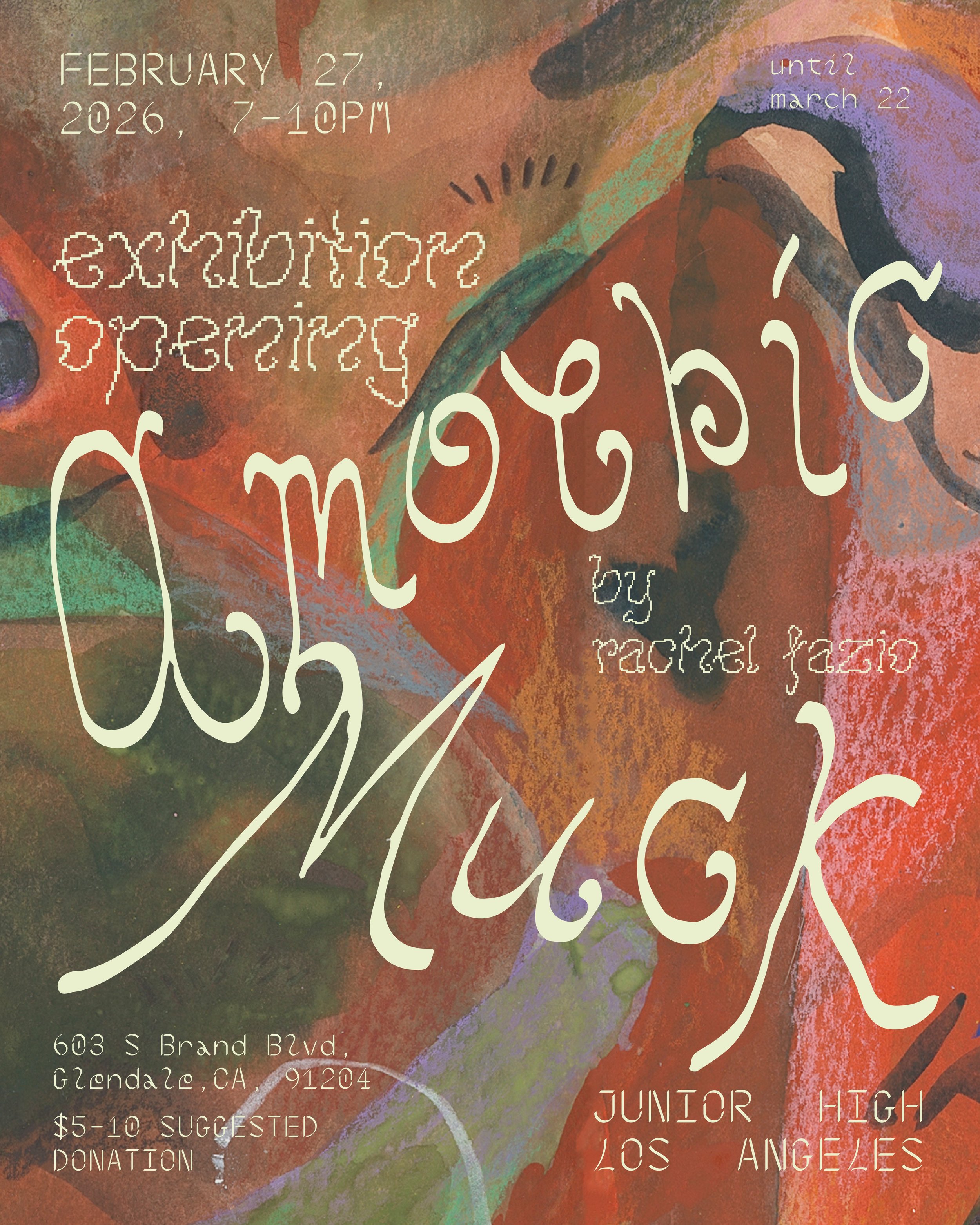Amoebic Muck is both prickly and swirling, and looking up at the sky from underneath the water. Amoebic Muck is the gooey stuff in the center. It is also a debut solo show by Rachel Fazio, featuring mostly abstract surrealist painted works.