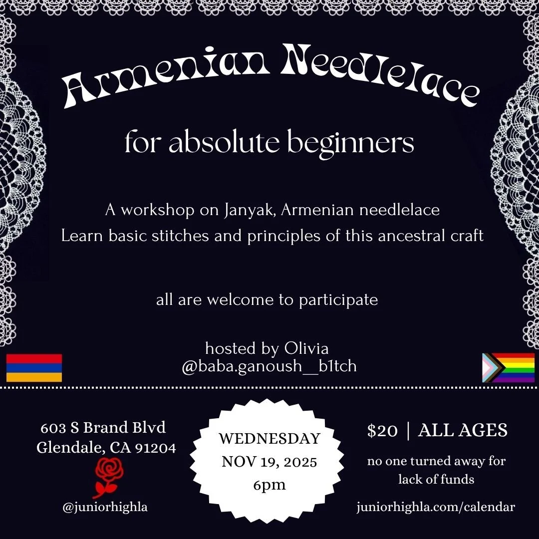 WORKSHOP | $20 | ALL AGES | Join us for an absolute beginners workshop on Janyak, Armenian needlelace. Created with simply a needle and thread, Janyak has been preserved through the instruction of many generations of Armenians even through separation and displacement. Come learn basic stitches and principles of this ancestral craft and leave with an adorned charm and material to continue practicing. All are welcome, no experience necessary.