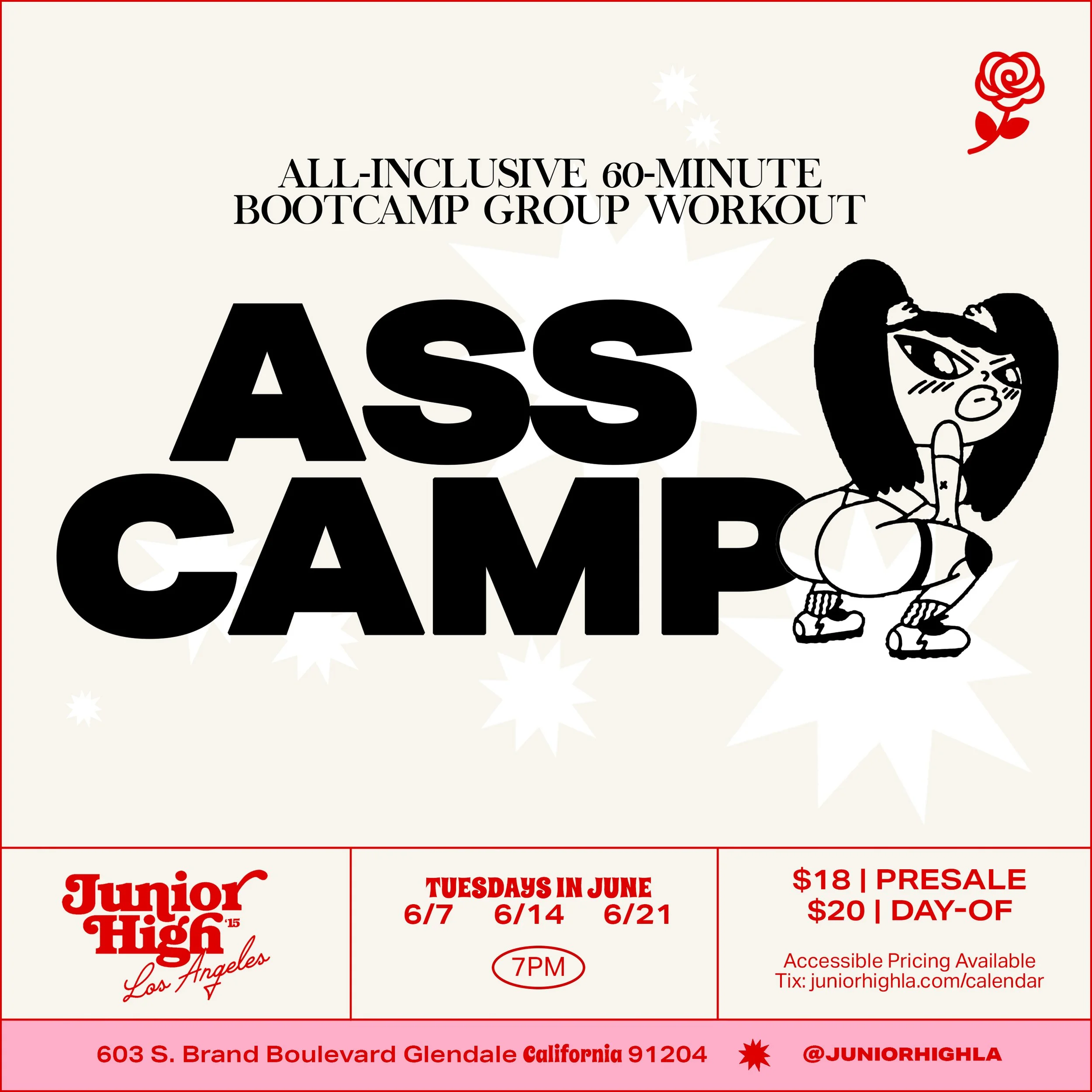 WORKOUT | $18 presale, $20 at door | ALL AGES + SKILL LEVELS | ASS CAMP is an all-inclusive 60 minute bootcamp group workout class led by Kat Matutina with focus on ass, abs, plus core and overall strength. Utilizing special resistance bands for the duration of the class, combined with plyometrics, toning balls, battle ropes and kettle bells. Soundtrack to class includes jersey club, baltimore club, dancehall and afrobeats, R&B, chicago house, booty bass, and rap. All bodies, genders, levels, and ages welcome! Organic pre-workout hydration station included with optional post-workout plant-based smoothies available as well.