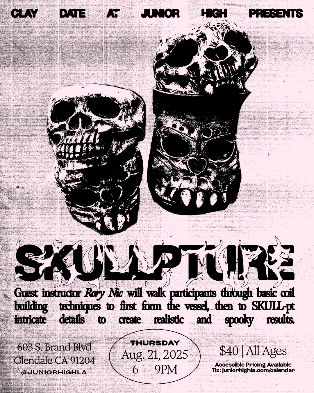 GUEST ARTIST WORKSHOP | $40 | ALL AGES | MASK MANDATORY | Use your cranium during this clay class as you will be instructed on how to make your own ceramic skull! Guest instructor Rory Nic will walk participants through basic coil building techniques to first form the vessel, then to SKULL-pt intricate details to create realistic and spooky results.