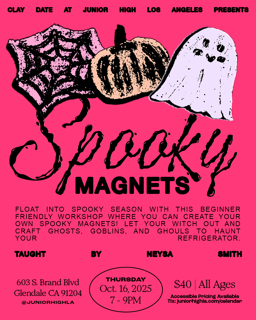 GUEST ARTIST WORKSHOP | $40 | ALL AGES | Float into spooky season with this beginner friendly workshop where you can create your own spooky magnets! Let your witch out and craft ghosts, goblins, and ghouls to haunt your refrigerator. Attendees will craft and paint 3-6 magnets in this class taught by Neysa Smith. She’s an October baby, so a natural lover of spooky season. She’s been practicing ceramics for 3 years at Pot and Element Art Center, developing a passion for hand building.