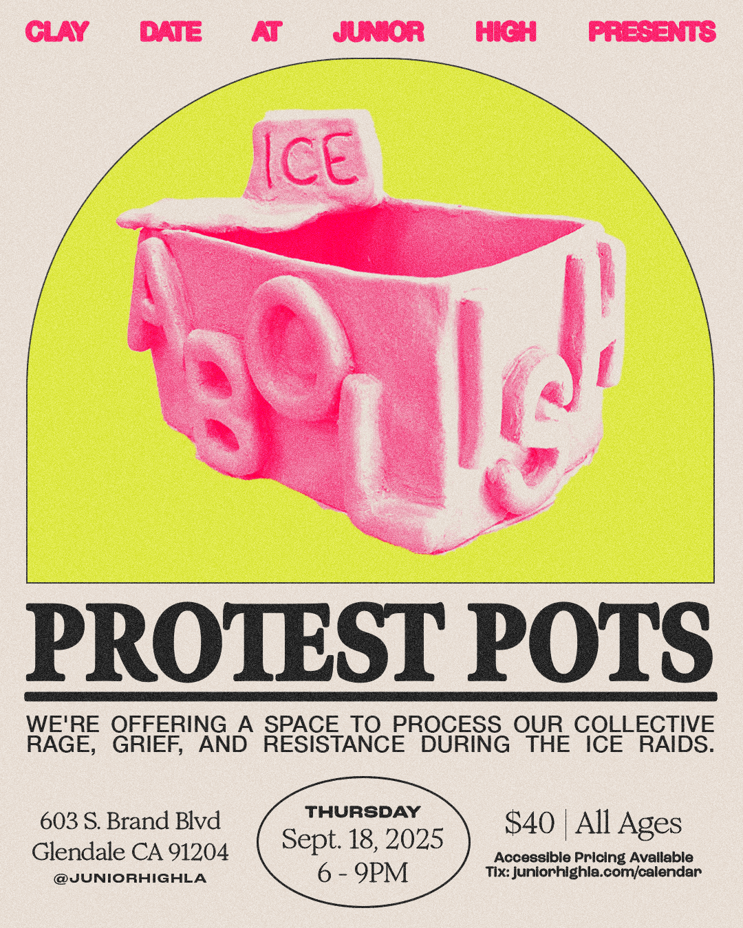 POSTPONED DUE TO LACK OF PRE-SALES| GUEST ARTIST WORKSHOP | ALL AGES | We're offering a space to process our collective rage, grief, and resistance during the ICE raids. Come make a protest pot with us! All materials will be provided including clay and tools to hand build a pot. Students will be taught how to create using pinch pot, coil, and slab techniques. Then guided to customize their pots by scoring and slipping additional elements to illustrate words or symbols in support of our immigrant communities.