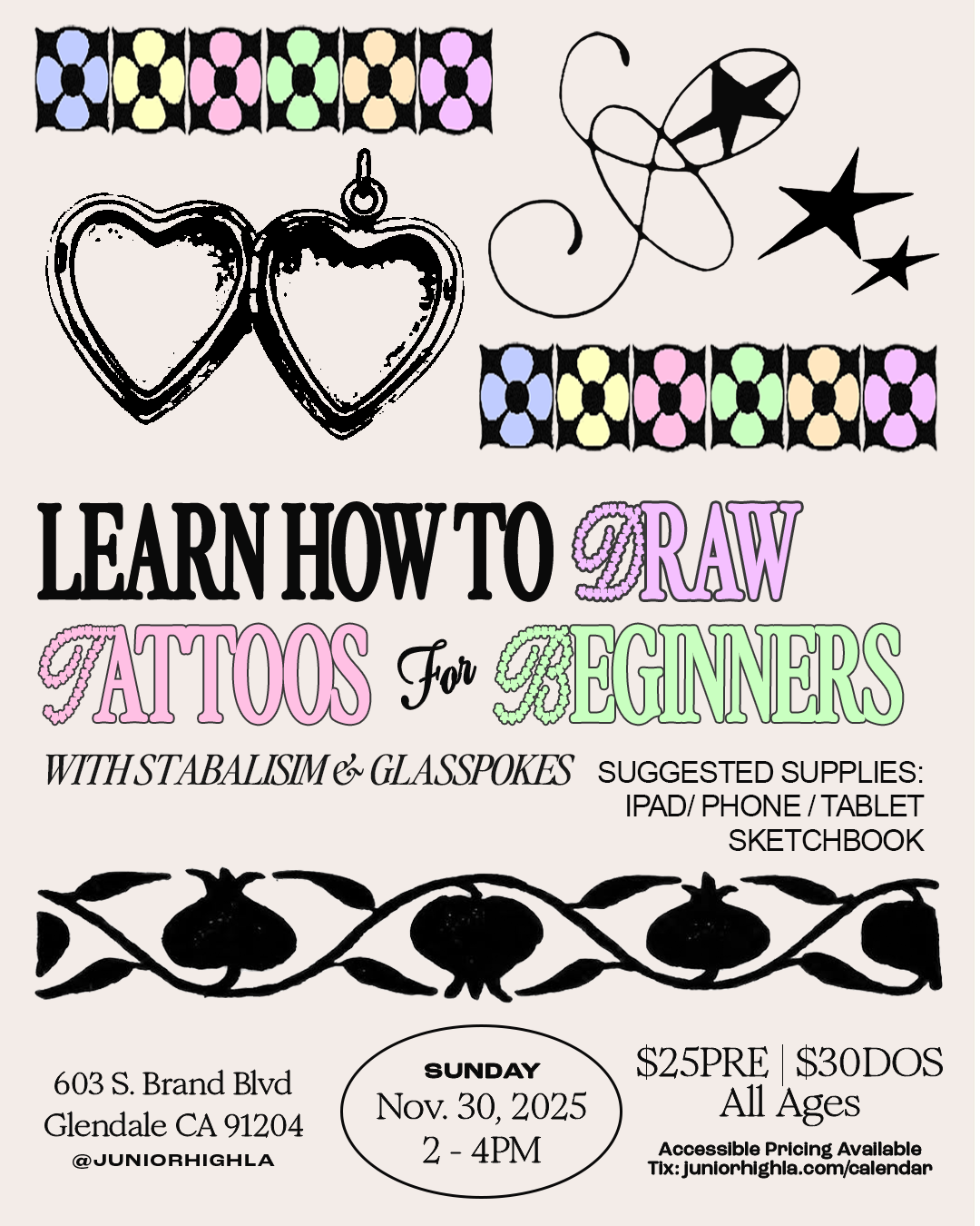 WORKSHOP | $25 PRE // $30 DOS | Alysea and JJ (@glasspokes and @stabalisim) are hosting their first intro to tattooing class for beginners, or artists wanting to learn how to draw for tattooing! They will go over: