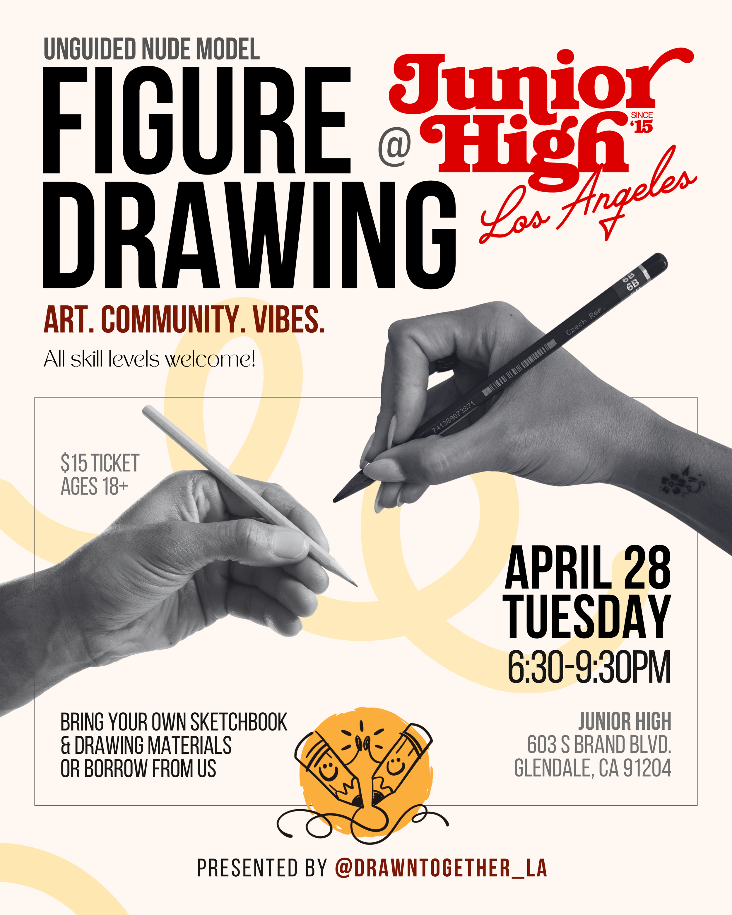 WORKSHOP | $15 | 18+ | Drawn Together LA is a community-centered unguided figure drawing event where people of all skill levels are welcome to draw from a model, be inspired by fellow artists, and enjoy a creative, safe space. Bring your sketchbook, favorite drawing supplies, or borrow from our materials. Let's draw together and make friends xx