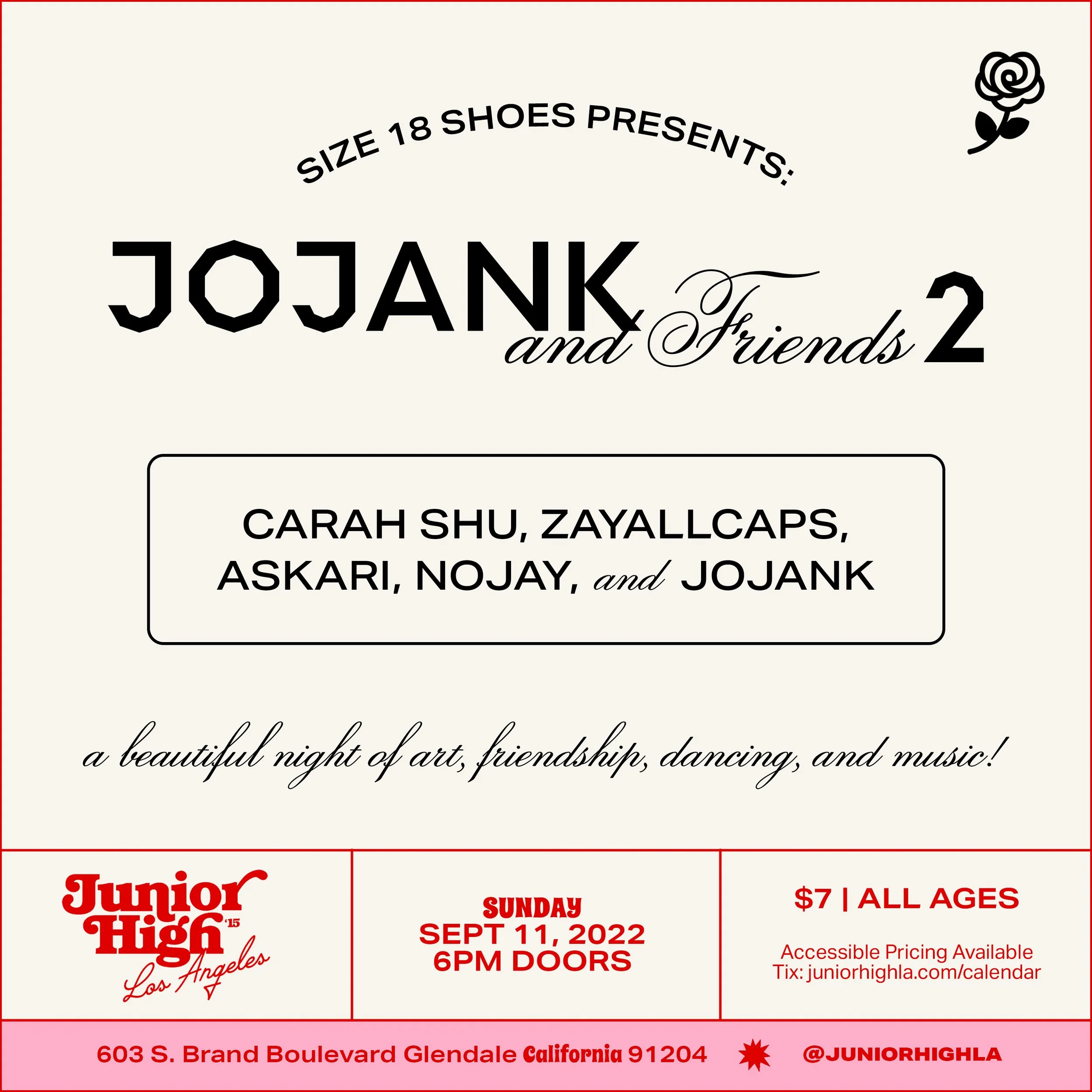 MUSIC | $7 | ALL AGES | JOJANK and friends comes to Junior High! This time with more music, and more homies!! Pull up for a beautiful night of art and friendship, curated by JOJANK. Hope you're ready to dance!