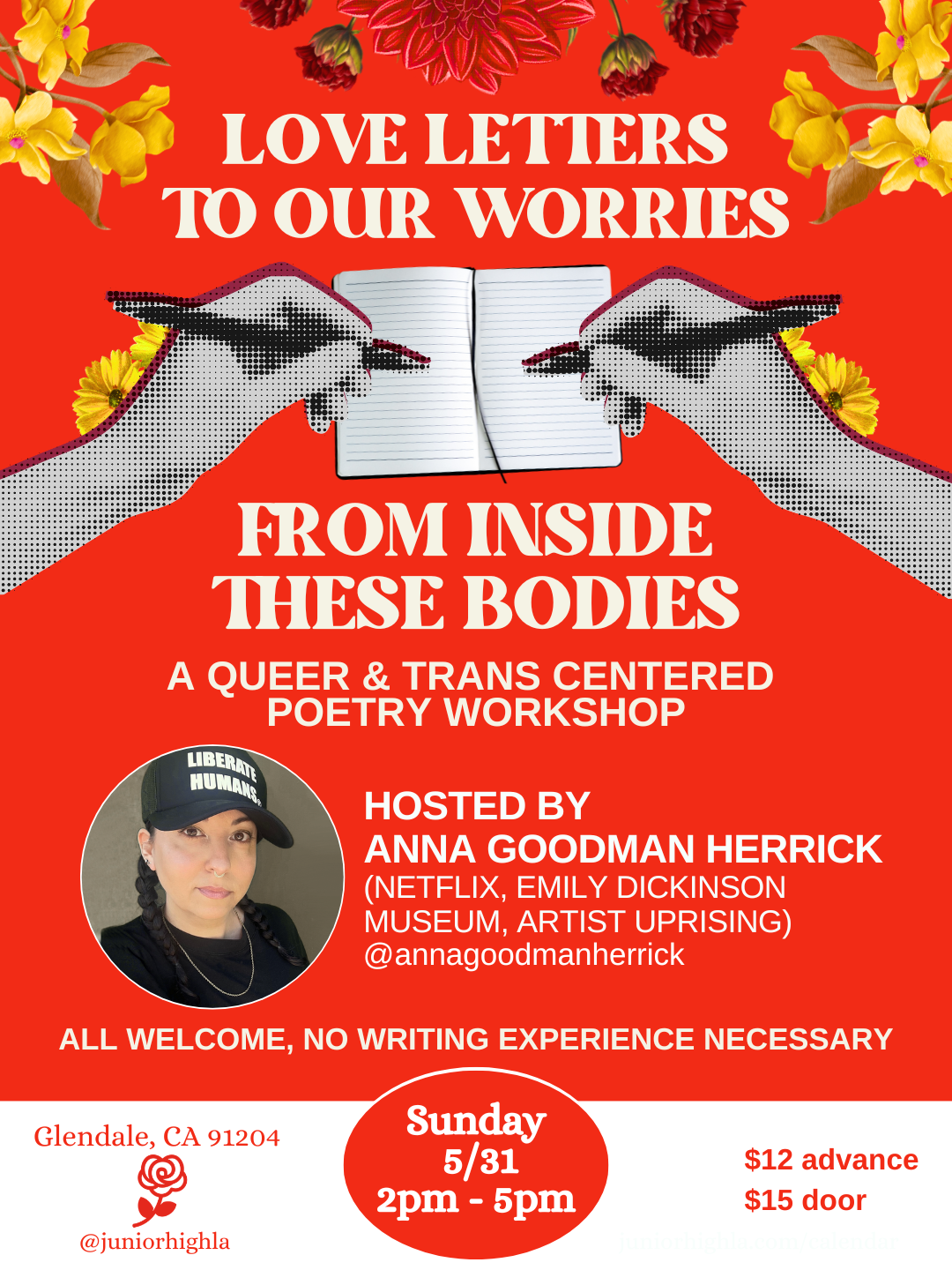 Anna Goodman Herrick @annagoodmanherrick (they/them) is the author of A Speaker is a Wilderness: Poems on the Sacred Path from Broken to Whole, available everywhere books are sold. They have performed and shared their work at the Emily Dickinson Museum, Artists Uprising at the El Paso Border, Bloomsday on Broadway, the Teen Vogue Summit and more. They have work on Netflix and the Oprah Winfrey Network. Anna’s book, A Speaker is a Wilderness, has been featured in magazines like Medical News Today and Lillith for its collective liberation-centered and healing words.
