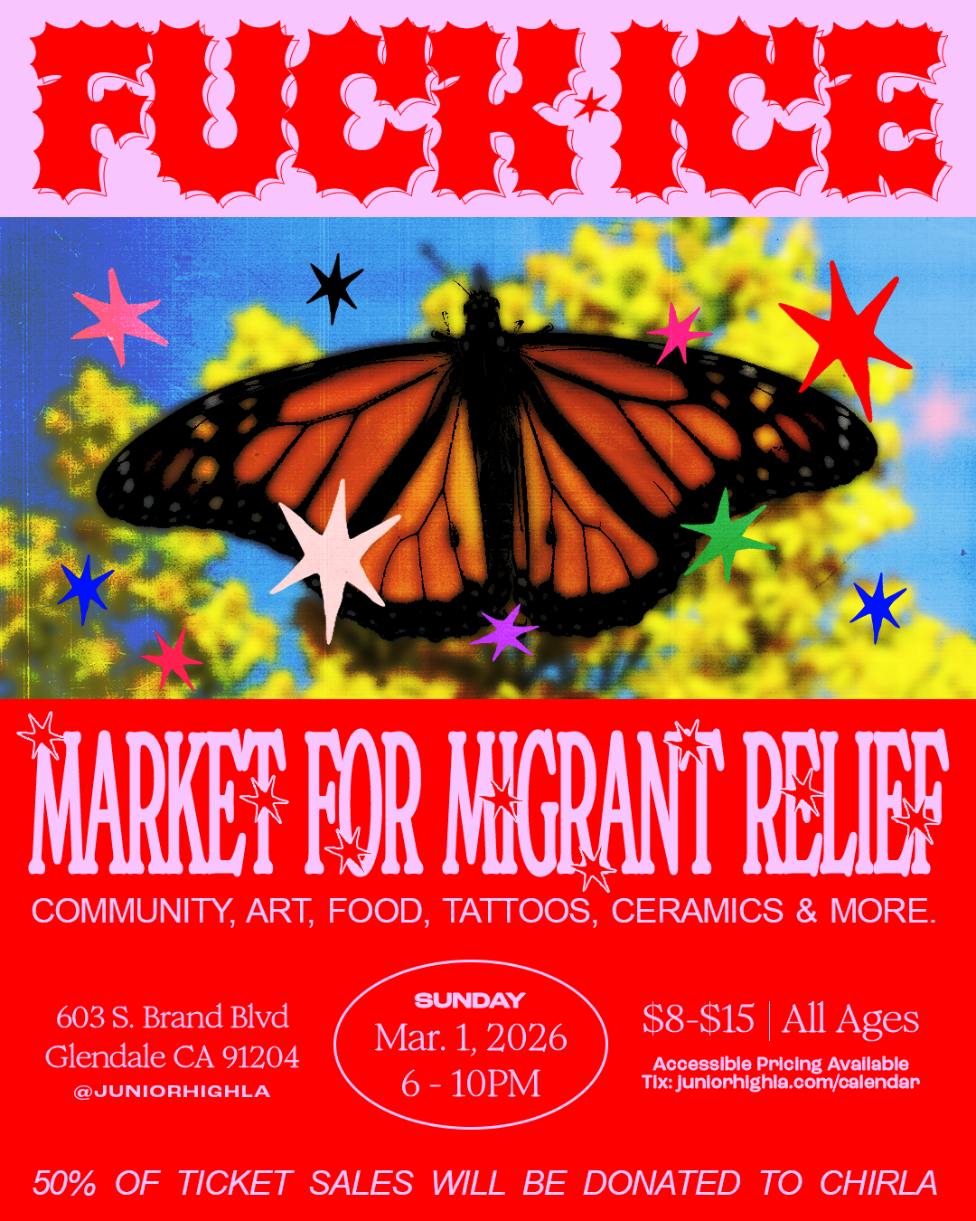 COMMUNITY | $8-$15 | ALL AGES | Join us for an evening of solidarity with immigrant communities affected by ICE raids through community, art, food, tattoos, ceramics and more.