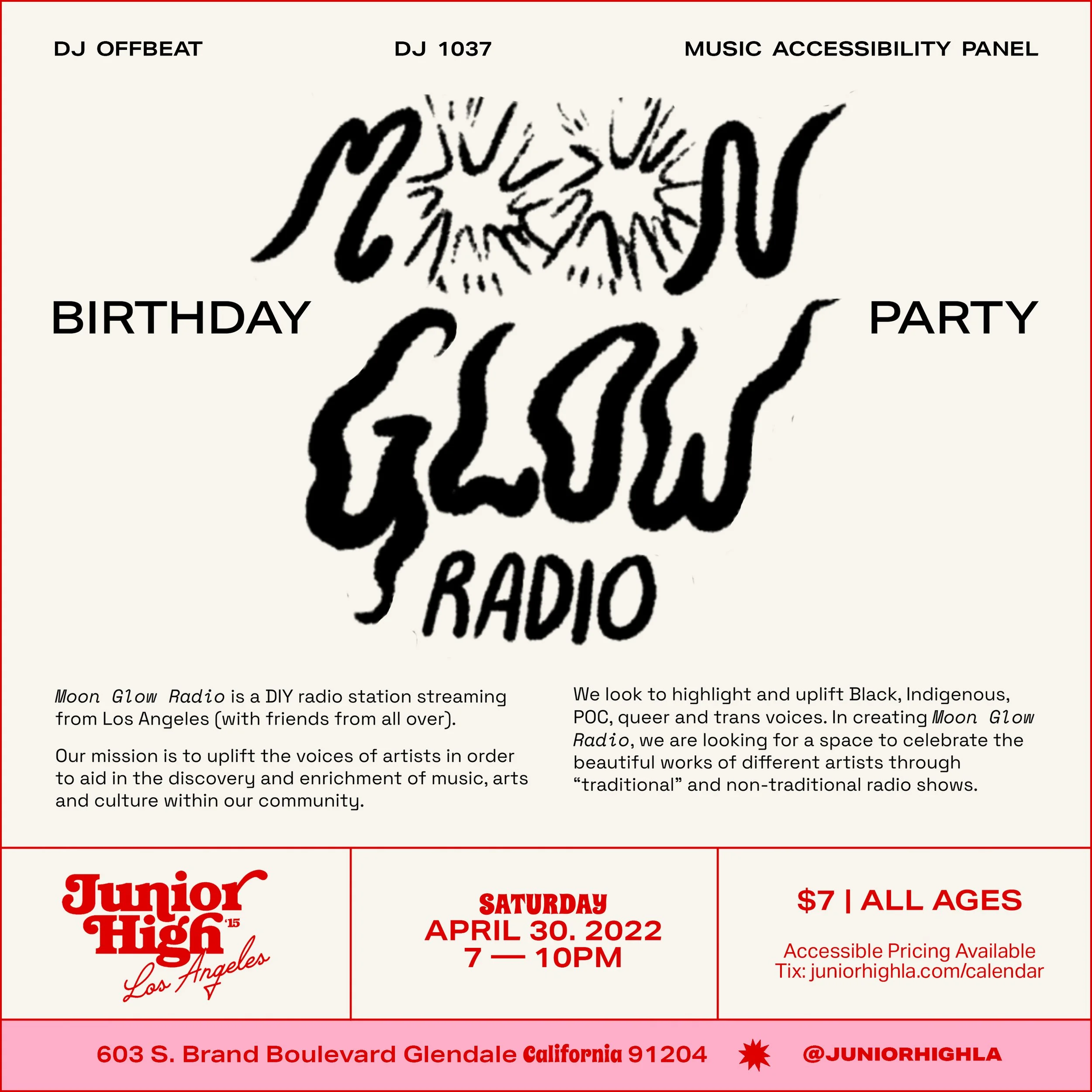 MUSIC + PANEL | $7 | ALL AGES | Moon Glow Radio is turning 1! Any other Taurus sun, Capricorn moons out there? Celebrate a whole year of music with Moon Glow featuring live DJ sets, a panel on music accessibility in LA, giveaways and more!