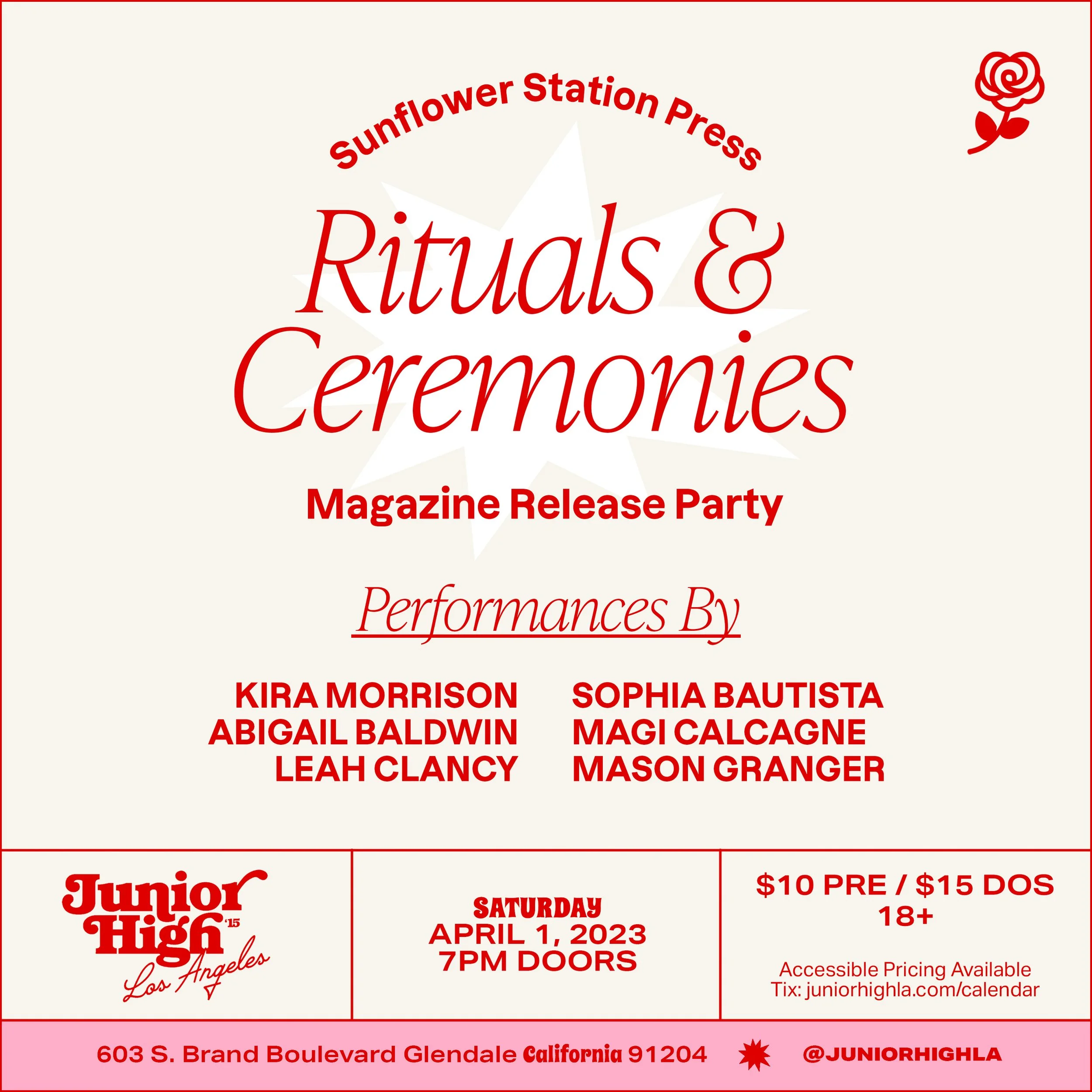 MUSIC | $10 PRE // $15 DOS | 18+ | Sunflower Station Press is happy to announce the release of our third magazine, "Rituals and Ceremonies." To celebrate, we have gathered a variety of performers together to put on an event that will surely be a unique and joyful way to bring in the Spring. Come enjoy performances by Kira Morrison, Leah Clancy, Abigail Baldwin, Sophia Bautista, Magi Calcagne, and Mason Granger, and support your local Los Angeles literary and publishing scene!