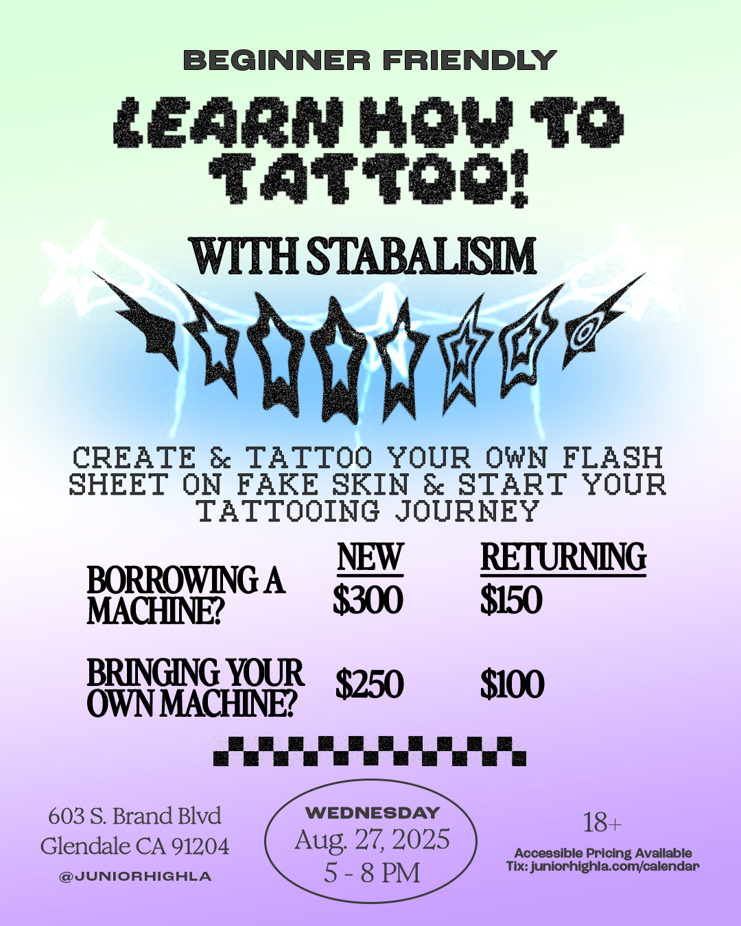 WORKSHOP | $250 // $300 | 18+ | Ever wanted to learn the art of tattooing? Junior High resident artist JJ wants to show you the ropes! In this workshop we’re disrupting abusive tattoo apprenticeship traditions and breaking down the culture of gatekeeping in tattooing by allowing interested artists to experiment on fake skin.