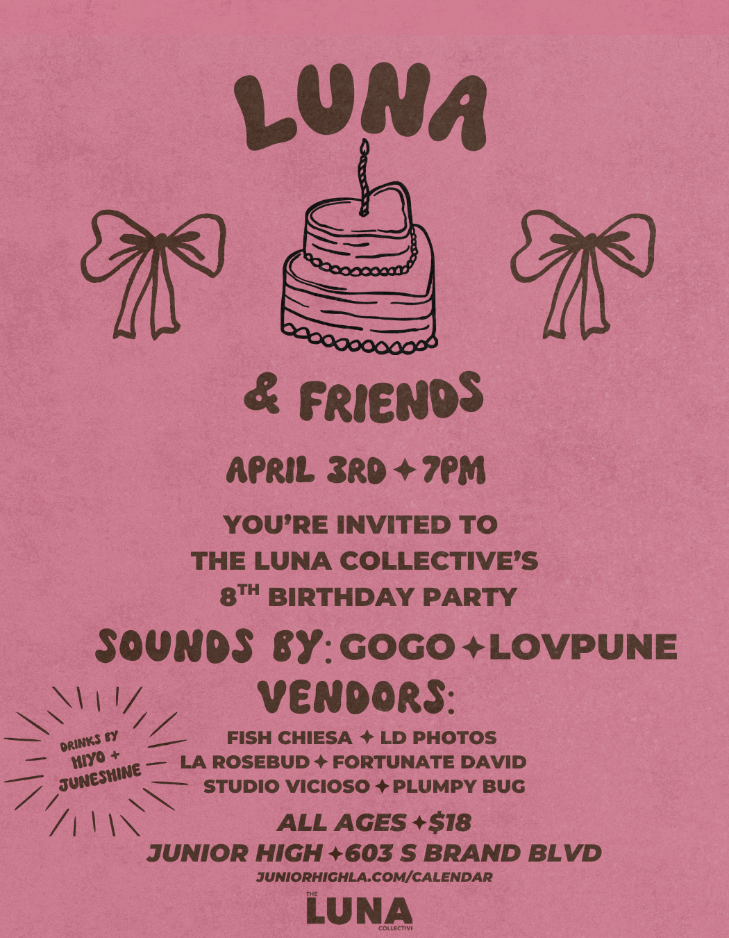 COMMUNITY | $18 | ALL AGES | Celebrate 8 years of The Luna Collective at Junior High! Enjoy live DJs, curated vendors including tarot readings, florals, ceramics, and crafts, alongside live portraits and Polaroids to capture the night. We’ll also have concert ticket giveaways from Goldenvoice and refreshing non-alcoholic sips from hiyo + hard kombucha from Juneshine.
