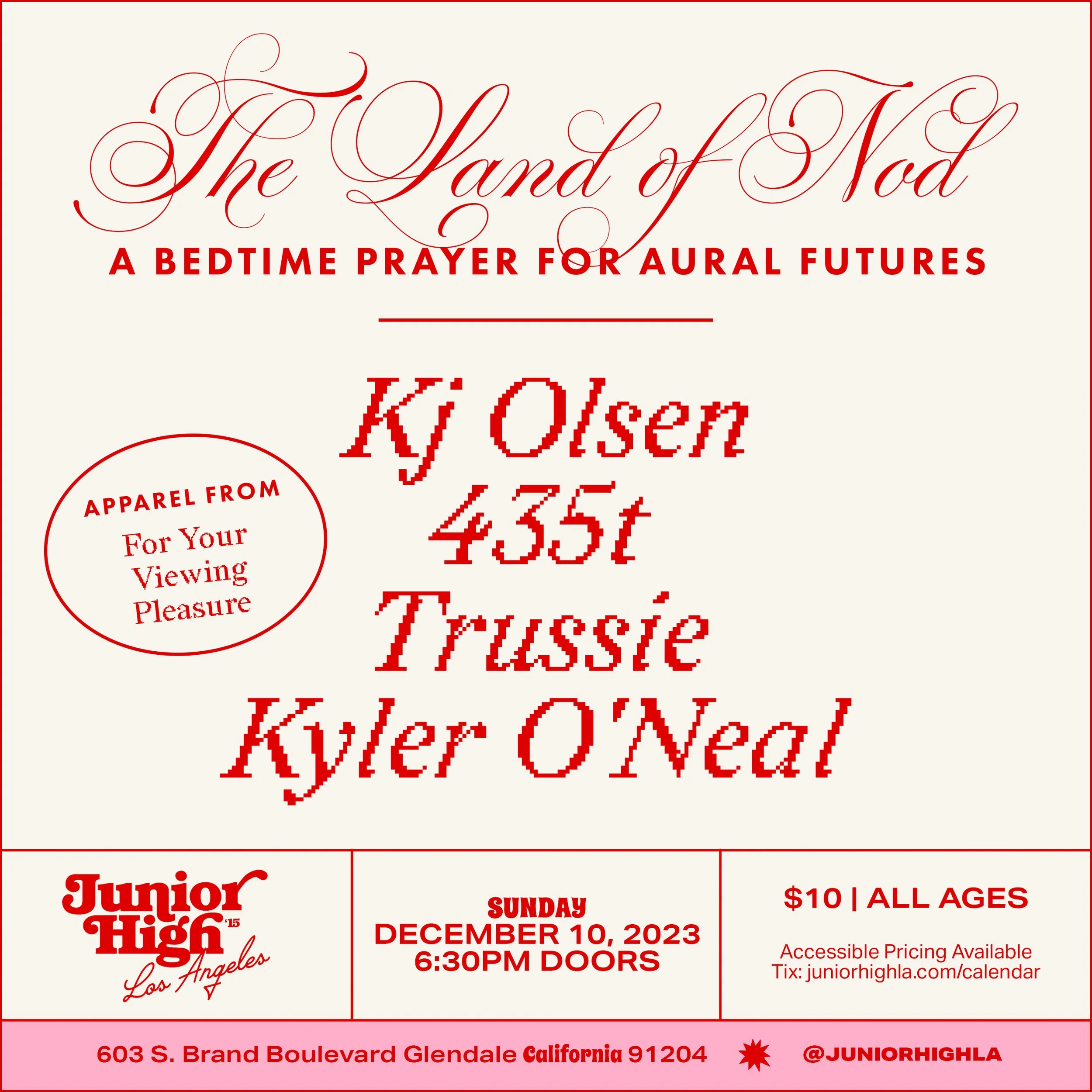 MUSIC | $10 | ALL AGES | You are invited to an intimate slumber party of ambient music. This bedtime show features dreamy soundscapes from KJ Olsen, Kyler O'Neal, 435t, and Trussie, as well as an art installation from Ann Valdés and apparel for sale from For Your Viewing Pleasure. Please bring a mat or cushion to recline and relax into as you get ready for bed with us in our very special bedroom. Dress code is your coziest PJs, some stim toys, and a warm cup of whatever. Unwind and do some yoga with us as we decompress, heal, and prepare for a new day.