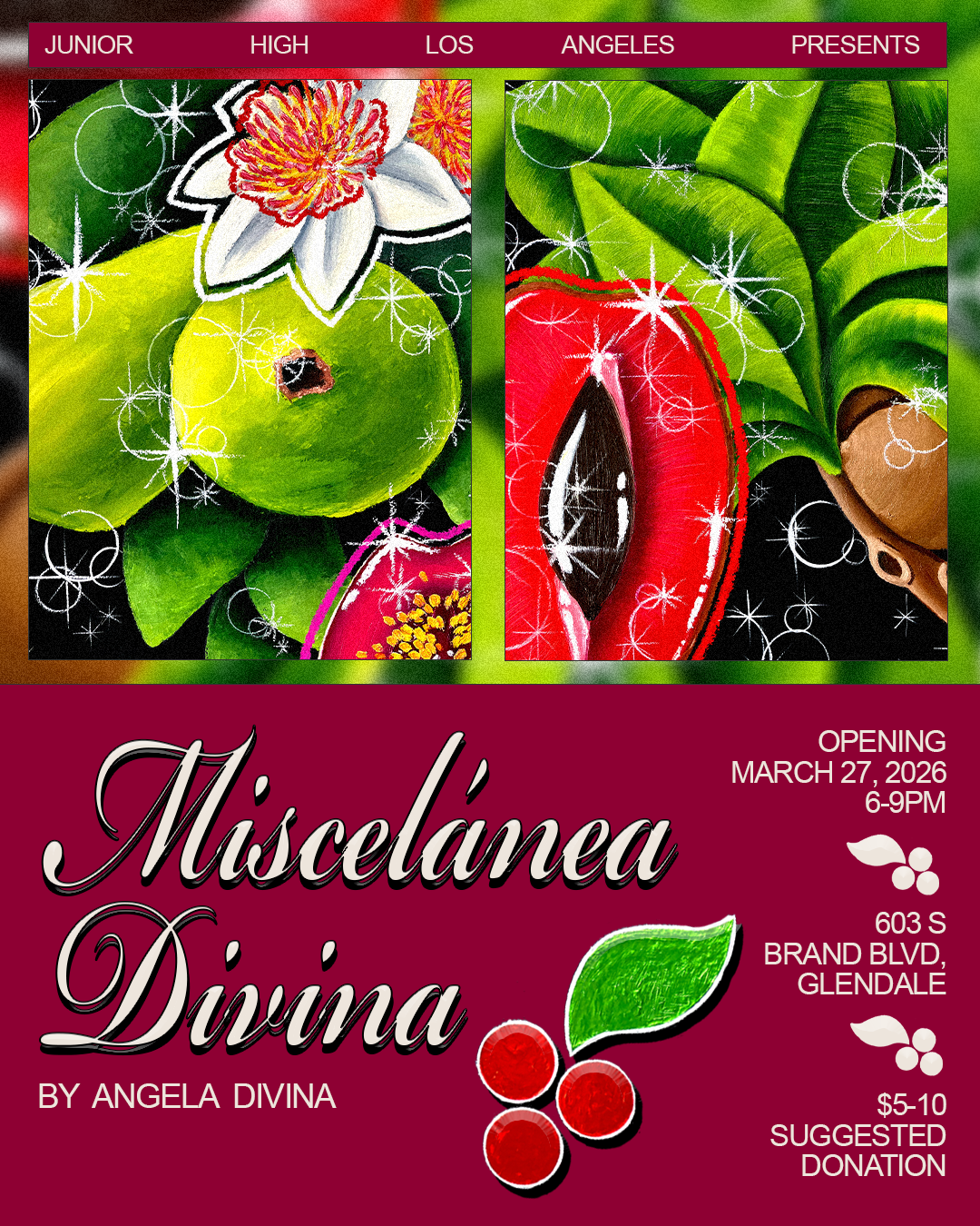 Exhibiting Artists include Angela Divina, Annais Morales, Bee Cisneros, Estefania Ajcip, Hannah Huntley, Jasmine Diana, and Kelly Cayuela. Curated by Monica Juarez and Susan Aparicio.
