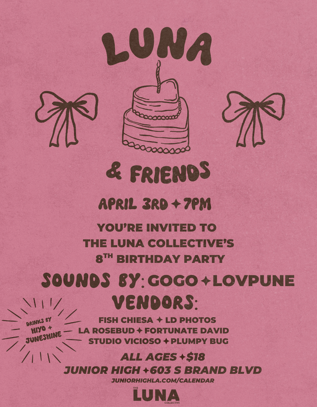 COMMUNITY | $18 | ALL AGES | Celebrate 8 years of The Luna Collective at Junior High! Enjoy live DJs, curated vendors including tarot readings, florals, ceramics, and crafts, alongside live portraits and Polaroids to capture the night. We’ll also have concert ticket giveaways from Goldenvoice and refreshing non-alcoholic sips from hiyo + hard kombucha from Juneshine.