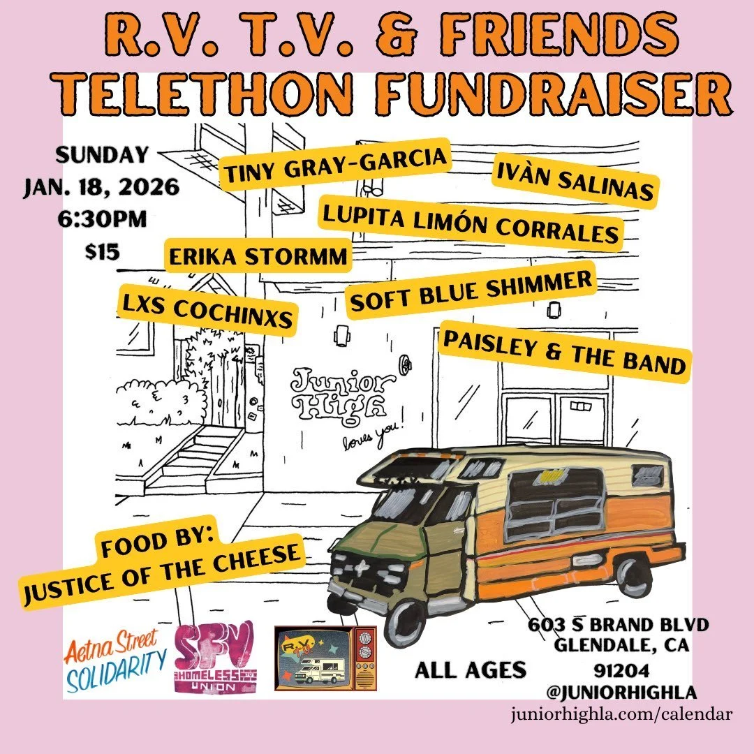 COMMUNITY | $15 | ALL AGES | Join us for an evening of poetry, music, art, food, and community power as we celebrate the new year & January birthdays while raising funds for R.V. T.V.! A harrowing mechanical failure and accident on Christmas has resulted in the loss of Aly the RV— @rvtvshow’s home & studio.